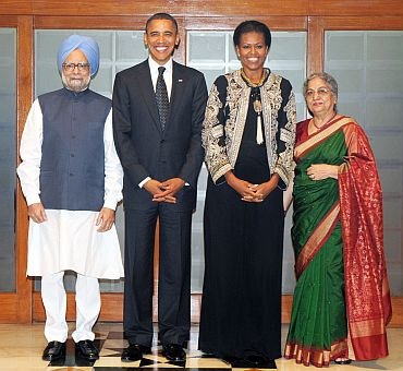 US President Barack Obama and the First Lady Michelle Obama with Prime Minister Manmohan Singh and his wife Gursharan Kaur at a dinner hosted by Dr Singh in New Delhi.
