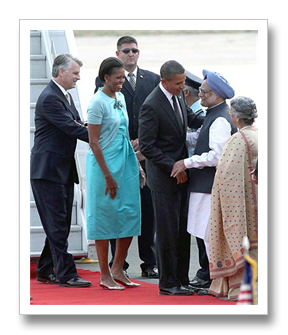 President Barack Obama and first lady Michelle Obama are greeted by Prime Minister Manmohan Singh and his wife Gursharan Kaur upon their arrival at New Delhi's airport.